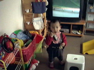 2001.1.10 電話中。 ちゃんとしたおもちゃ用電話も選別して使用するが、「もしもし」って振ると手元にないときには手に持ってたカミッペラでも素手でも受話器に変身。 |