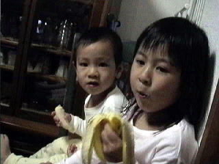 2001.10.17 夫が珍しく飲み会だった日の夕食・・・それはバナナ。 この人たちが食べたいって言ったんだよ〜。 生協で届いたばっかりの5本のバナナが即座になくなる。 |