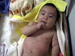 2001.10.31 突発の熱がひいて出てきた発疹。(わかりにくいか) 胴体がまっかっかでぱっと見るとビックリするほど。 |
