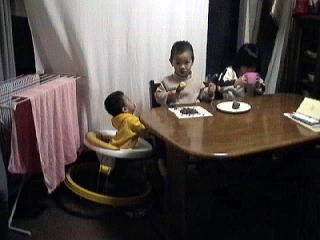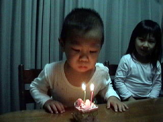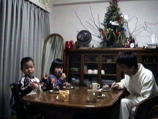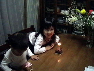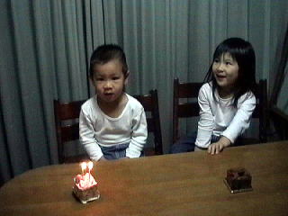 ![]() ![]() 2001.12.8 ちなみに妻の誕生日に冬馬のお誕生祝い。 台のケーキを買っても絶対食べきらないので一人ずつ、便乗してかれんも「ふー」 |