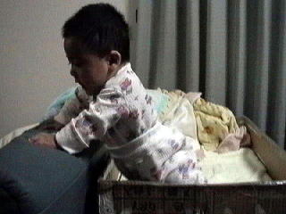 2001.12.11 ベッドで着替えをさせるとこういう風に動き、だんだん危なげ。 |