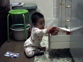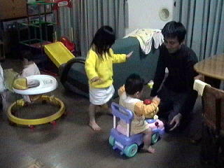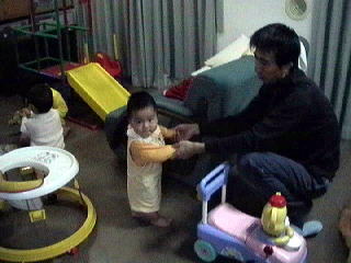 2001.12.21 マシン(歩行器)に乗せているとものにつかまりマシンをがっしょんがっしょんいわせて暴れる。 食べるものには特に敏感ですぐによってくる。 |