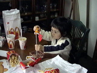 2001.2.12 ハッピーセットはおもちゃが大きくてお得な感じ。 すぐに飽きちゃうけど、まきのけのおもちゃ達はこういったものとかいただいたもので9割5分を占める。 |