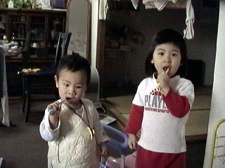 2001.2.21 いつもは洗面所(親のいるところ)で歯磨きするのに、 撮影しようと思うとリビングまで来てしまった。 冬馬もいっちょまえに自分からやりたがる。仕上げ磨きも嫌がらないので助かると言えば助かる。 |