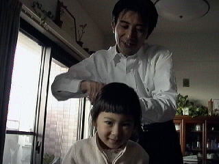 2001.2.22 パパはポニーテールが好き(らしい)。 このにやけた顔ったらないね。 |