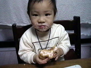2001.2.24 おやつシリーズその2 苺シュークリーム (うれしそ〜に、おいしそ〜に食べていた) |