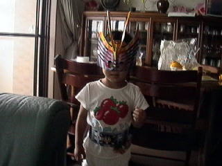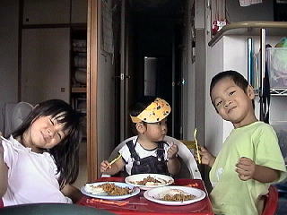 2002.8.25 子供テーブルでカレー しぇきがかぶってるサンバイザーは青葉幼稚園の未就園児開放の日に冬馬が色をつけたもの(紙) |