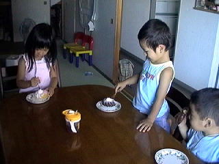 ![]() ![]() 2002.8.30 かれん4歳の誕生日♪ ケーキは食べるかどうかわからないので、ミスドのデコレーションドーナツで軽く。 |