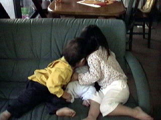 ![]() 2001.4.26 二人に襲われる青希。チユーされまくり 並べてみるとかれんと冬馬の成長を実感。大きくなったよなー、冬馬が兄ちゃんに見えるもん |