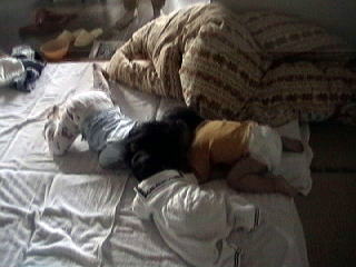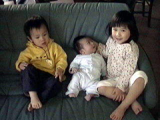 2001.4.29 ためしに青希をうつぶせにしてみた。 わらわらと寄ってくる二人、パジャマのかれんとオムツの冬馬。 |