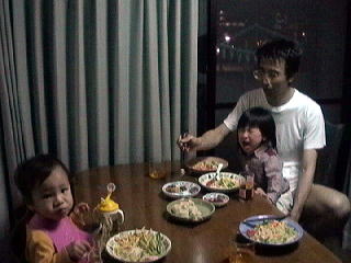 2001.5.15 おいしく楽しい冷やし中華なのにかれんは大泣き(-_-) 冬馬は一人で黙々と食べてる。 |