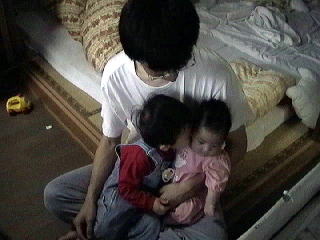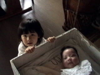 ![]() 2001.5.27 冬馬も青希が好き かれんの髪を切った。また前髪が短くなった。妻にはカットのセンスがないようだ。 |
