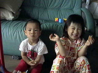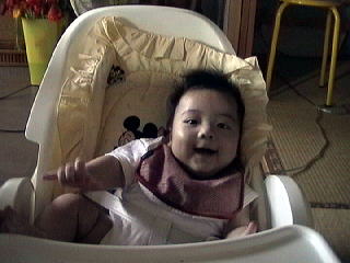 2001.7.20 話し掛けると笑顔の青希。必ず右足が上がっているので斜めってる。 |