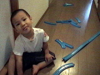 2001.7.17 いただいたプラレールをなぜか家のど真ん中の廊下で組んでいる。扉を開ければ涼しいリビングなのに・・子供の不思議。 |