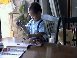 2001.7.20 はさみで切れるようになった、でも逆さもち。 切れの良い大人用のはさみだけど、結構大丈夫らしい。 一回指をはさんで呼ばれたけどちょん切るほどの力はない。 |