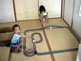 2001.7.20 パパにトミカのレールを組み立ててもらった。 冬馬は大喜びで飽きもせず「ばちゅばちゅ」言いながら遊んでいるが、かれんはすぐに飽きてほかのことをはじめる。 |