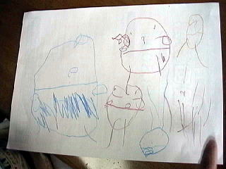 2001.8.11 いつのまにか手や足や口がついたものを書くようになっていたかれん。 左/パパ 上中/ママ 上左/冬馬 下左/かれん 下中/青希(髪の毛ボーボー) 下左/花 |