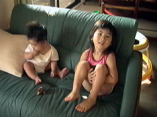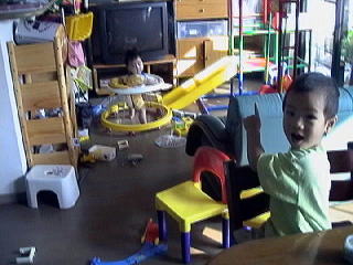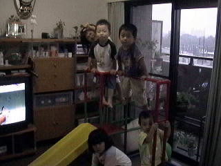 2001.9.21 久しぶりにお友達が遊びに来た、今回はこうた君が初参加。 こうた君と妹のももかちゃんはかれんと青希の誕生日とほぼ一緒。 |
