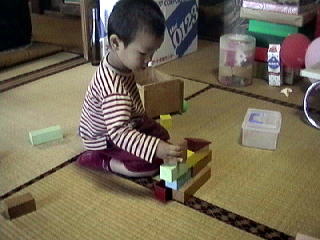 2001.9.23 松尾では積み木がおもちゃ。 家ではいろんなおもちゃに混じってて積み木として機能していないのに、それしかないと積むものだ。 |