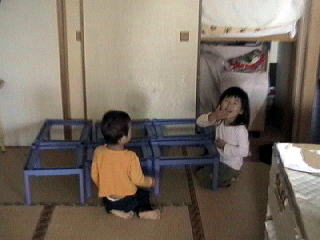 2001.9.24 テーブルでご飯中とのこと。 これは何かと言うとプラスチックの安い引出しの枠で、引き出し部分はおもちゃいれとしてスチールラックに使用するのでごみになるところ。 (ごみを増やして罪悪感がないわけではない・・・) |