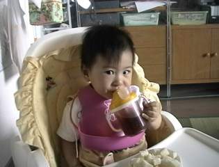 マグマグを自分で持てるようになったので朝は角切り食パンと麦茶で妻もらくらく♪粗食でごめんね。