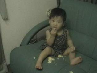 H11.9.9 ロールパンを食べ散らかすの図。 ビデオの設定いじったらソフトフォーカスに なったちゃった。 |