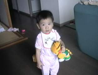 H11.9.18 1歳になったので子供チャレンジぷちを はじめてみた。予想以上にしまじろうが 気に入ったようで教えてもいないのに しまちゃんだけは抱きかかえる。すごいなぁ。 この写真だと髪が吉田拓郎みたいだ。 |